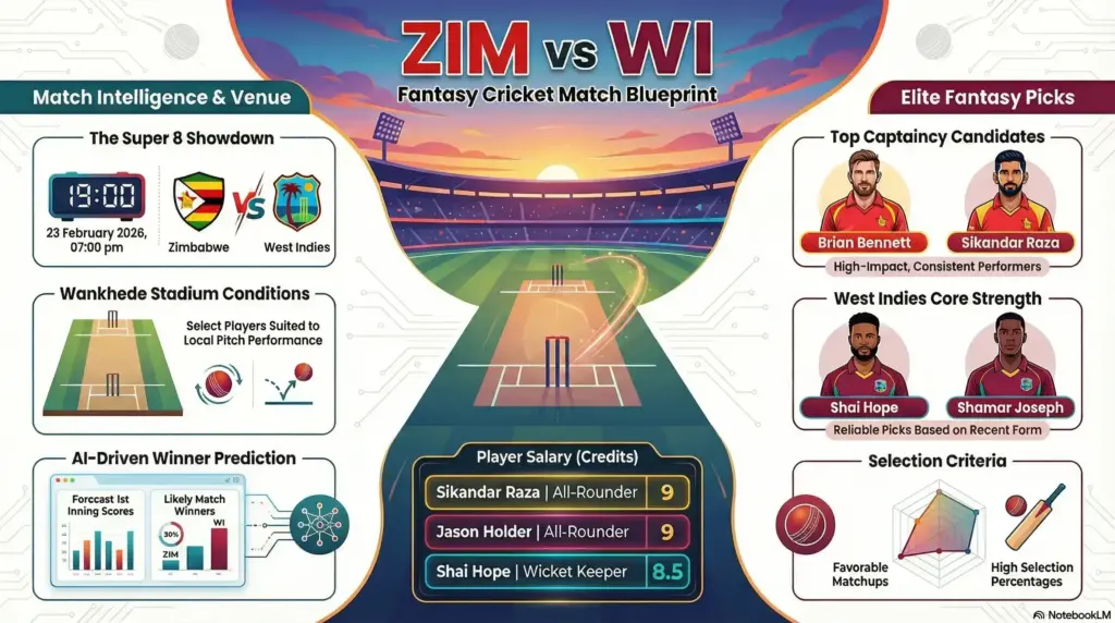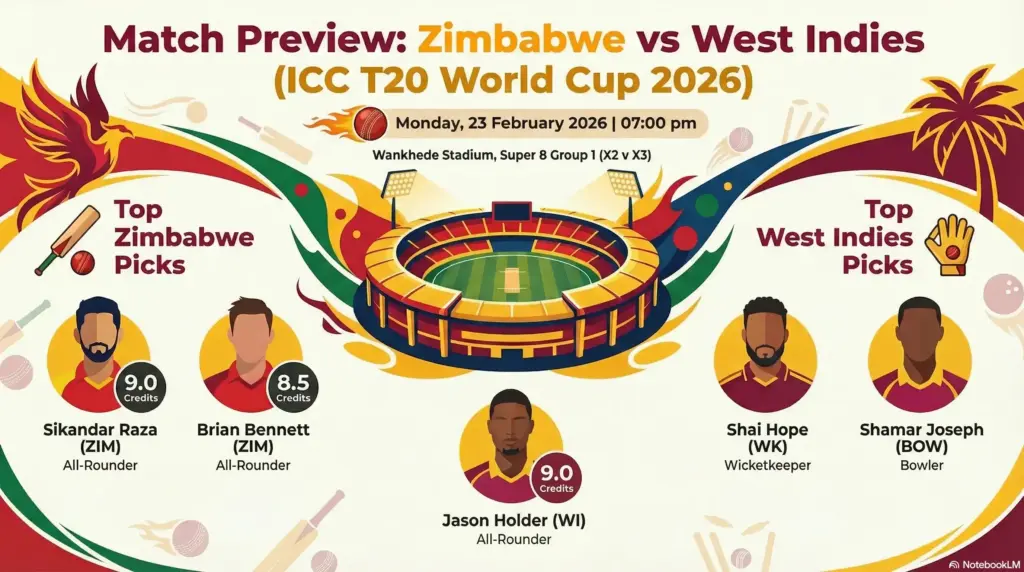 Zimbabwe faces West Indies in a high-stakes Super 8 clash at Wankhede Stadium, Mumbai, on February 23, 2026. Both teams enter unbeaten after topping their groups, setting up a rare showdown.